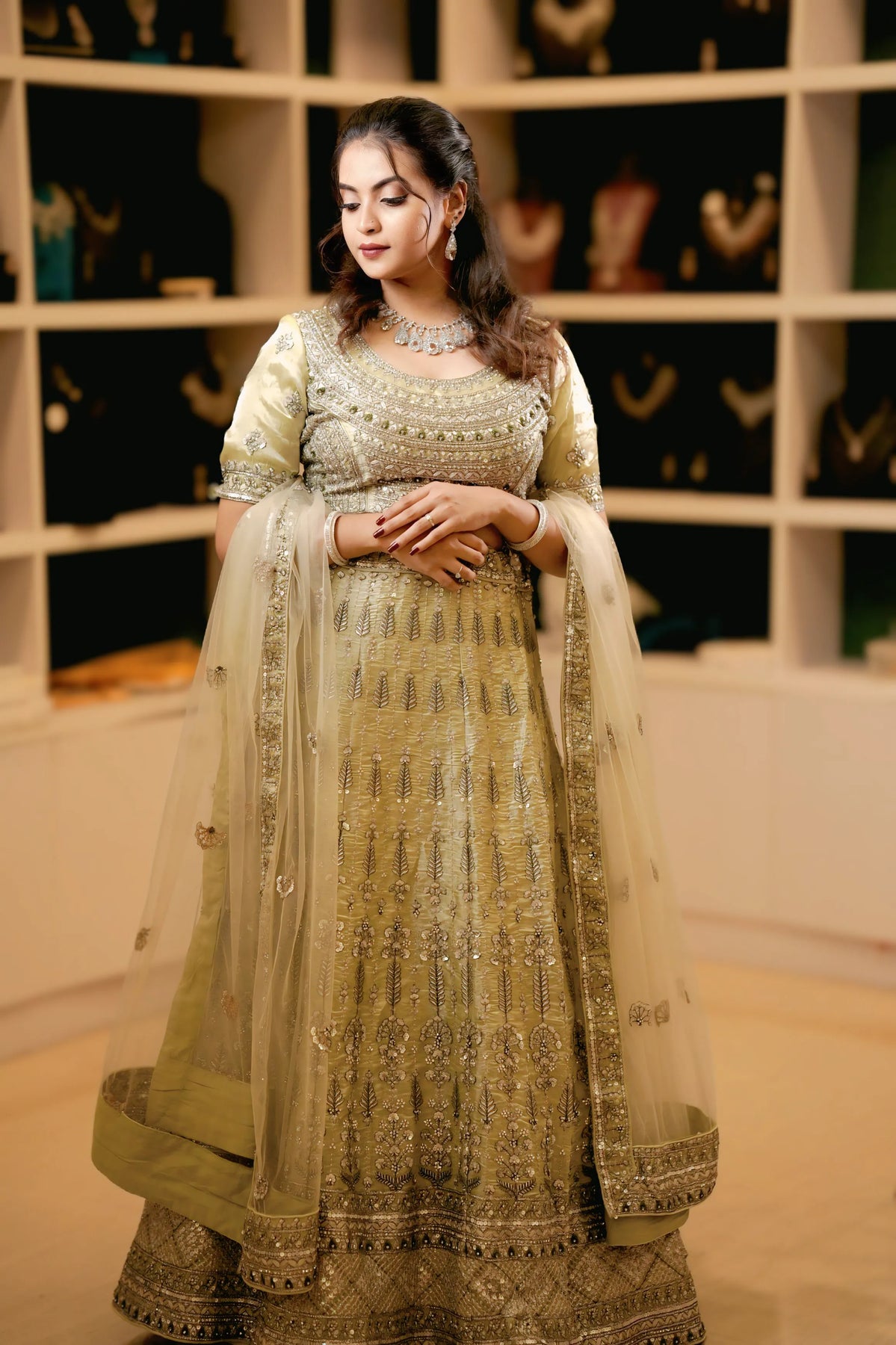 Step into royal elegance with this golden embroidered lehenga set, crafted for brides and bridesmaids who love timeless glamour. The blouse features intricate thread and sequin embroidery with elegant half sleeves, while the lehenga is richly designed with vertical motifs and heavy detailing, creating a regal silhouette.