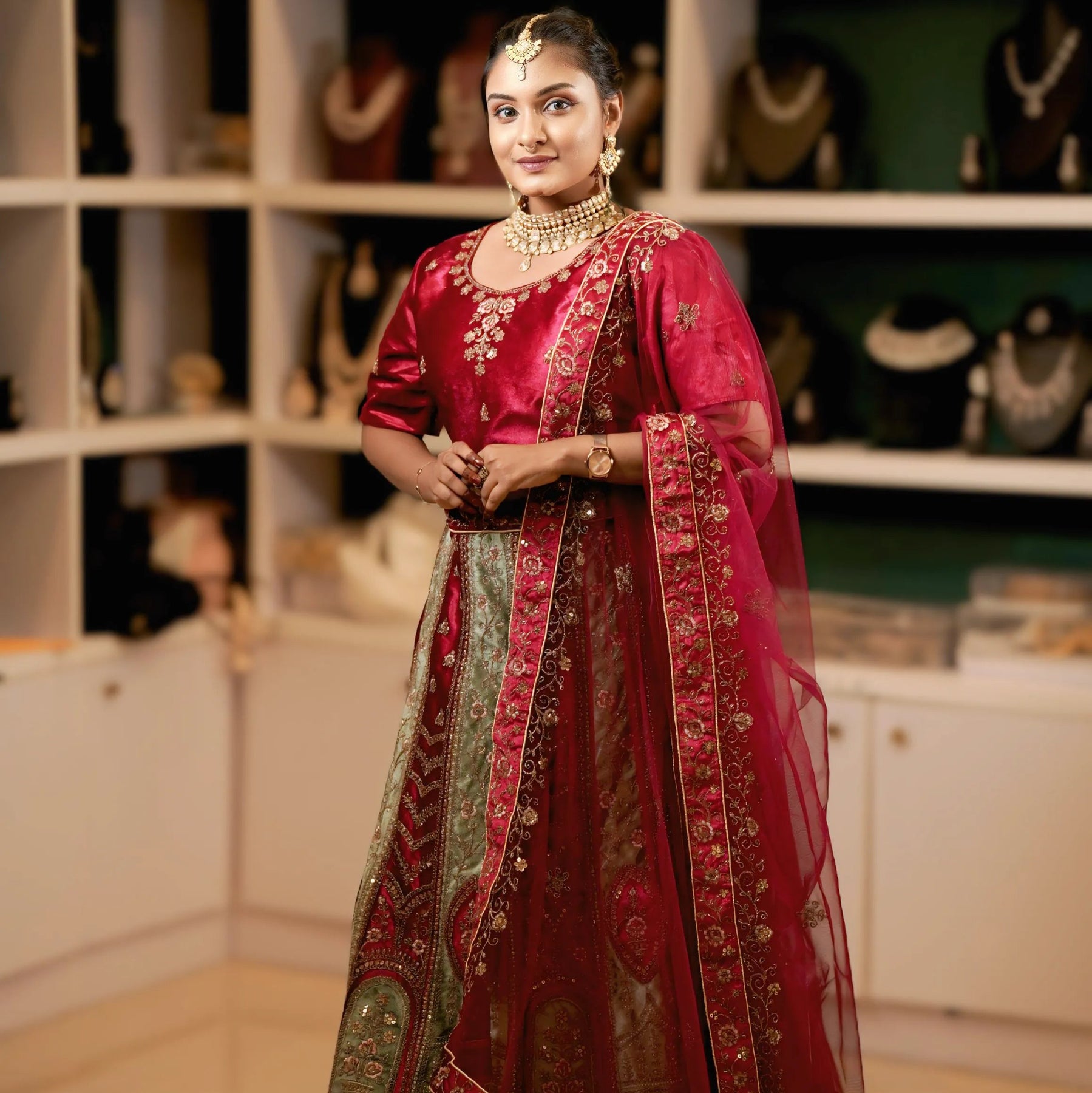 Our Maroon Silk Bridal Lehenga brings together luxury, tradition, and timeless beauty. The rich silk fabric paired with golden zari embroidery and subtle green undertones creates a striking contrast, making it perfect for brides who want to blend tradition with sophistication.