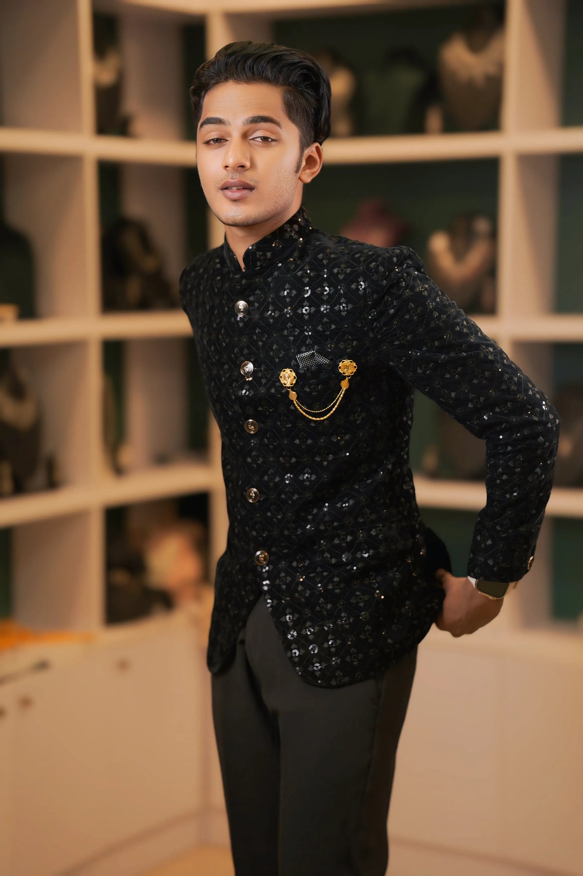 Our Black Sequin Jodhpuri Suit blends tradition with glamour, making it an ideal choice for modern grooms. Designed with intricate sequin work and highlighted by a golden brooch chain, this outfit ensures you look royal and stand out on your big day.