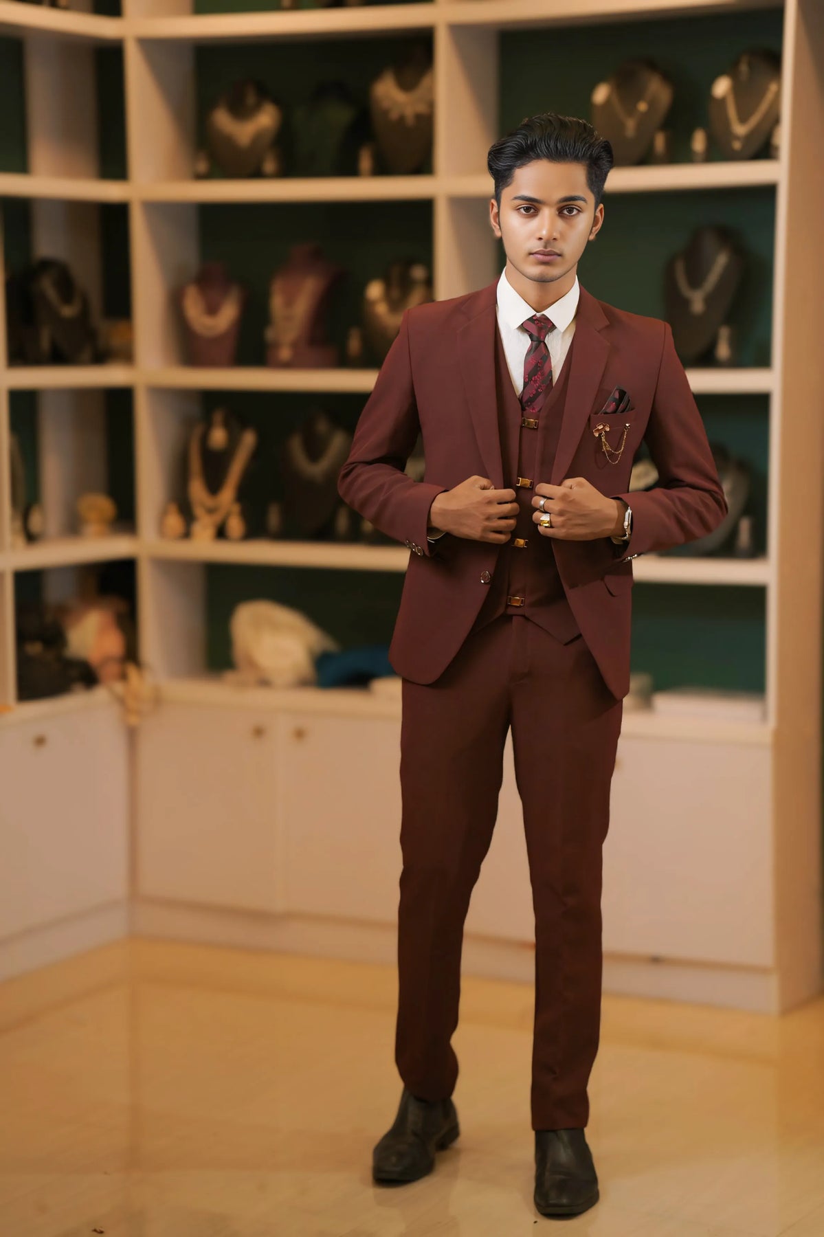 This Maroon Three-Piece Suit with Tie is designed for men who want to radiate confidence and sophistication at weddings and special events. The deep maroon tone gives a royal charm, while the three-piece design ensures a polished, structured look.