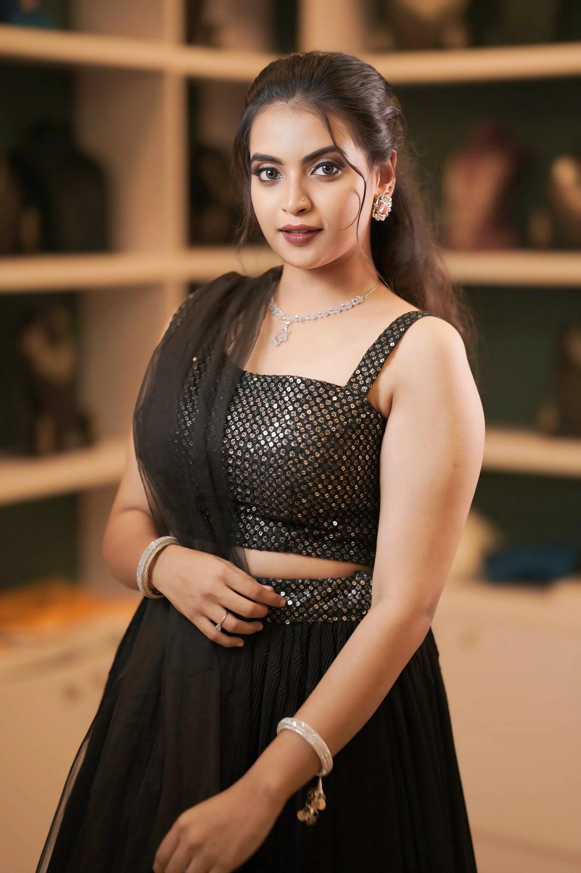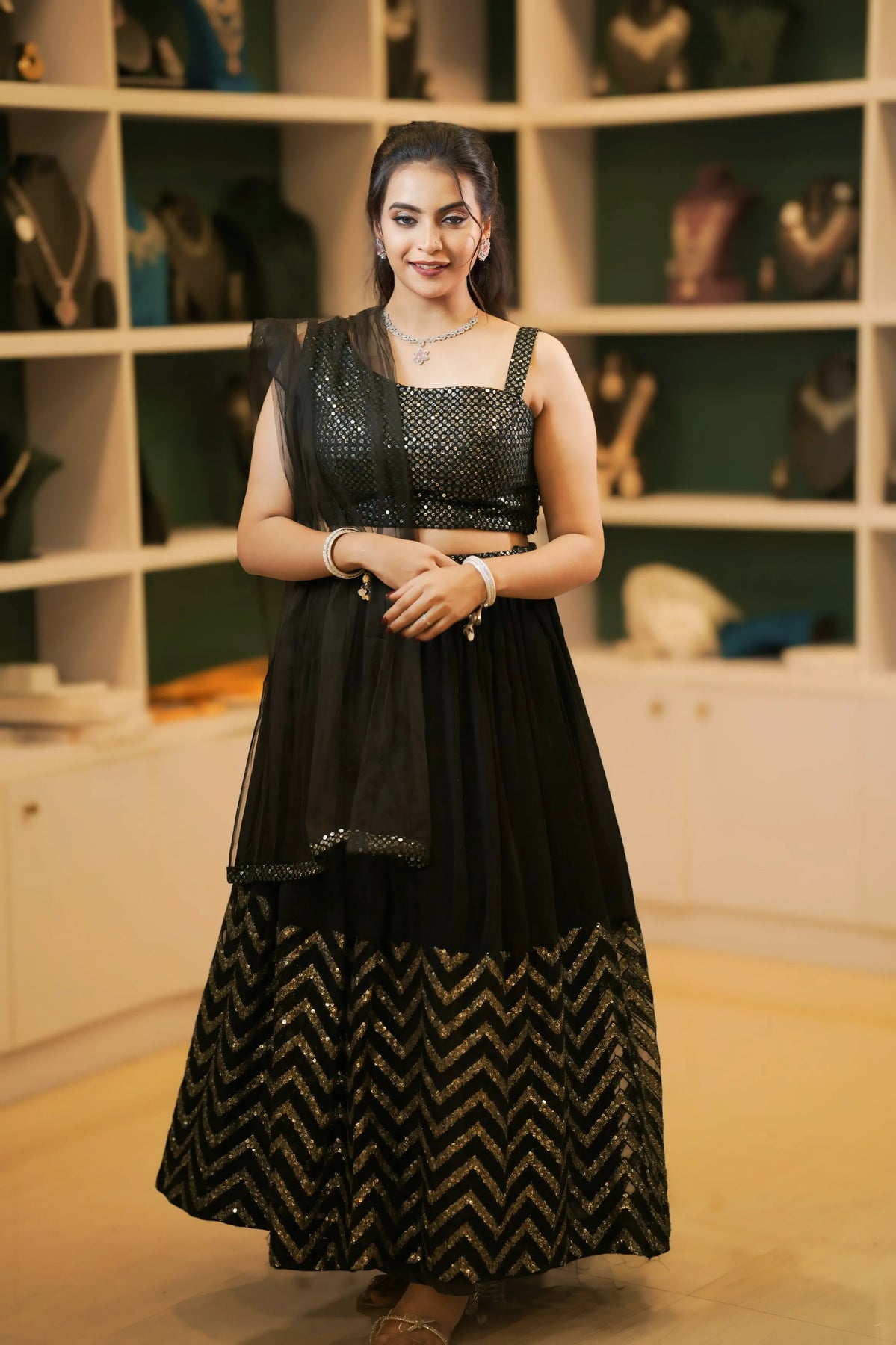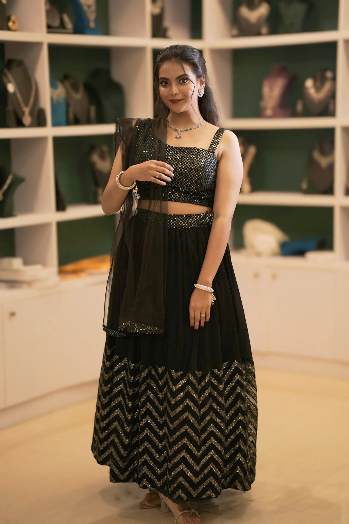 Dazzle in this black & gold crop top outfit, featuring a sequined sleeveless blouse, a golden zig-zag embroidered skirt, and a sheer black dupatta. Perfect for cocktail parties, receptions, and festive evenings, this Indo-western style balances modern chic with traditional elegance.