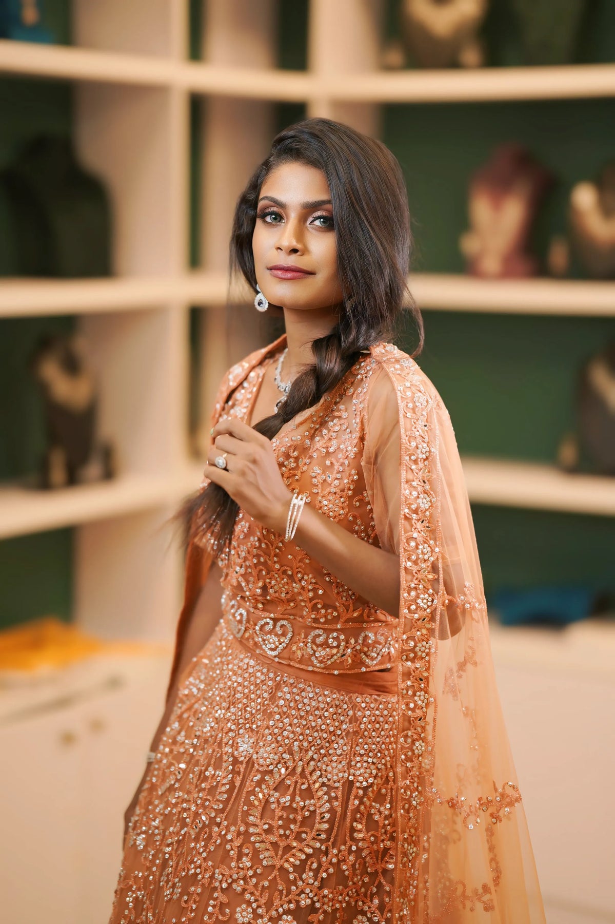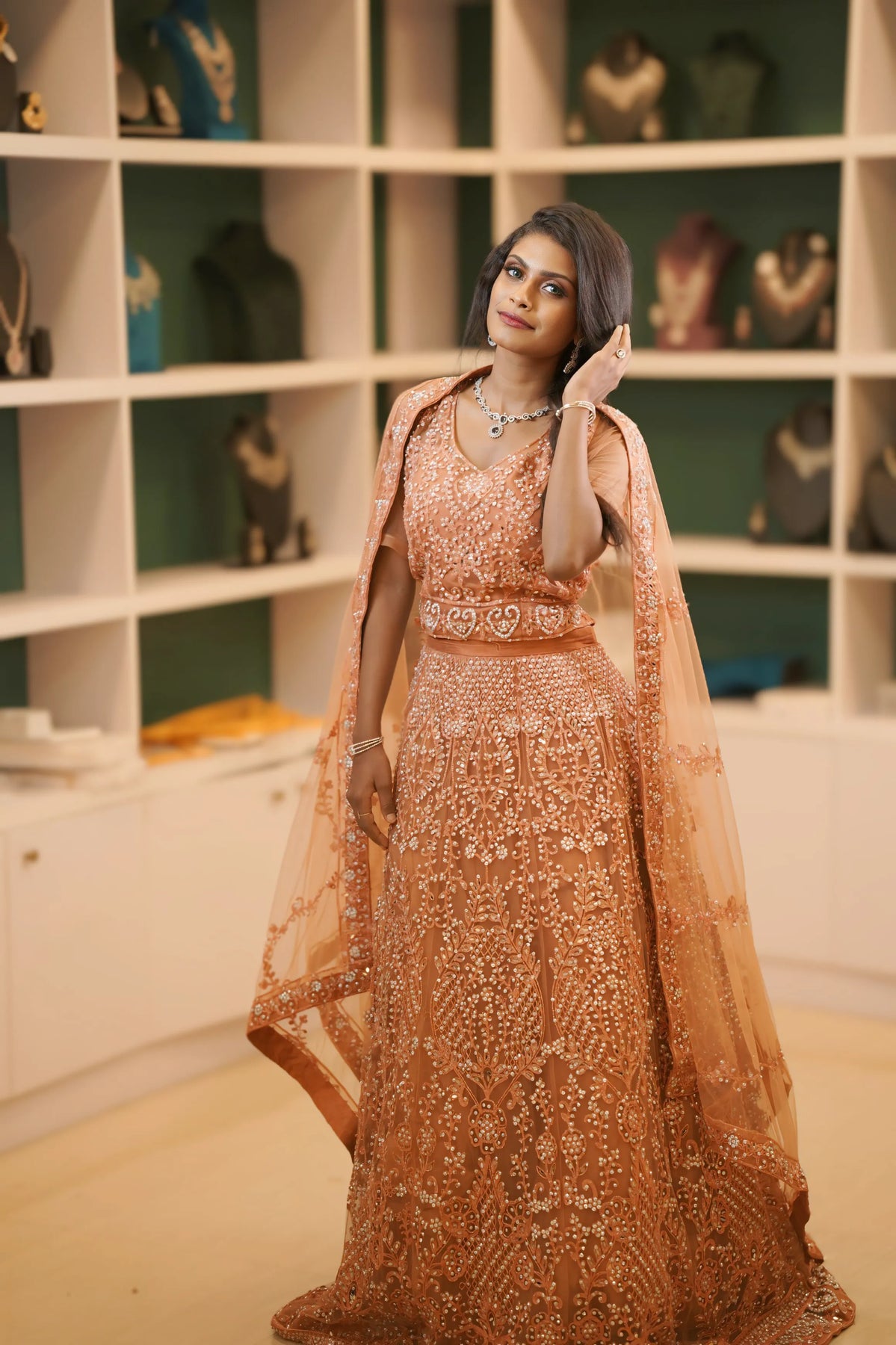 Turn heads in this copper peach crop top lehenga, richly embroidered with sequins and floral motifs. The sleeveless crop top paired with a heavily embellished flared lehenga and matching dupatta makes it a glamorous choice for receptions, sangeet functions, and modern bridesmaids.