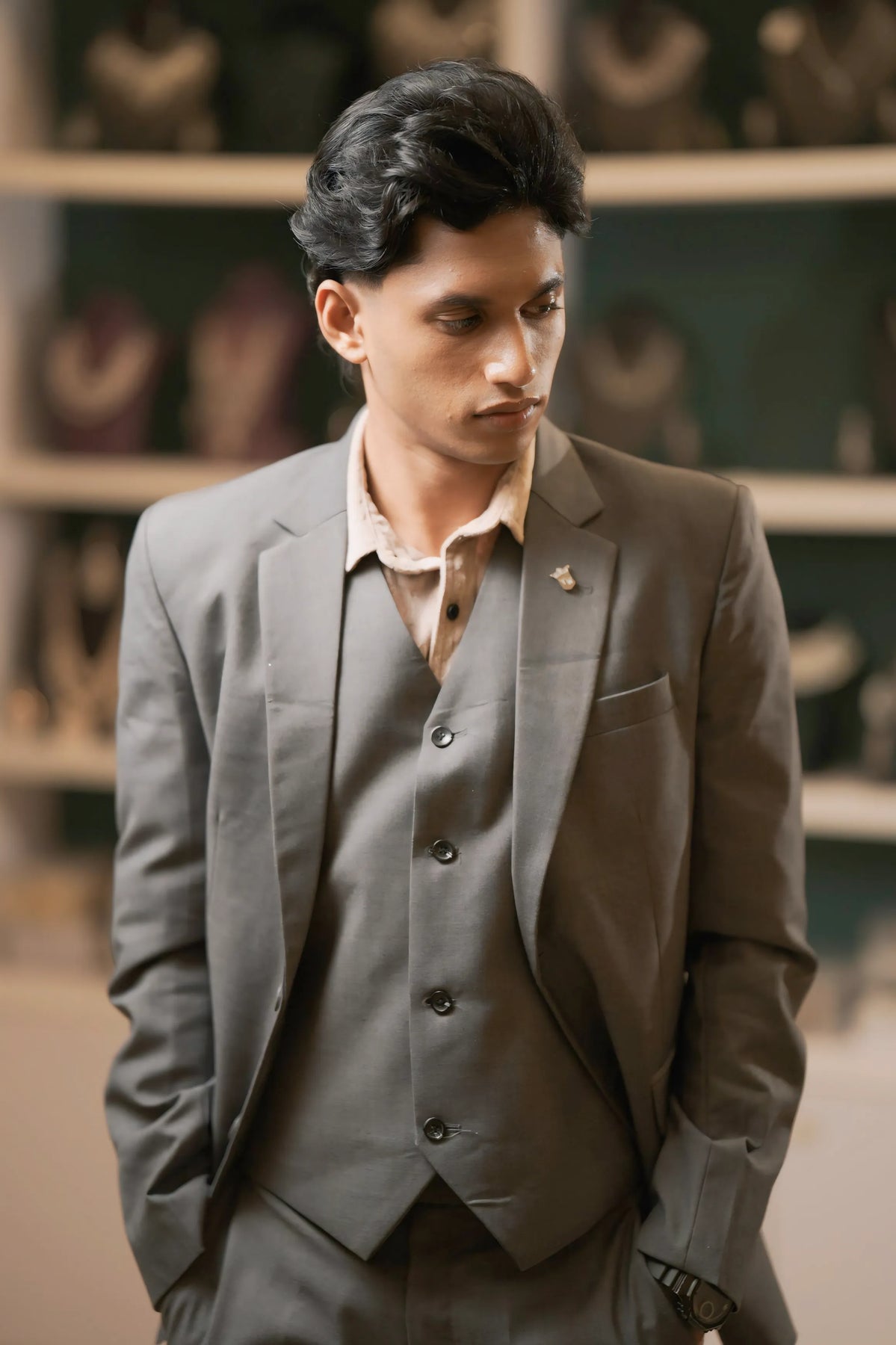 Stay sharp and stylish with this grey three-piece suit, designed for grooms, groomsmen, and modern wedding guests. Featuring a tailored blazer, matching waistcoat, and trousers, this outfit is perfect for receptions, engagements, and formal occasions. Pair it with a crisp shirt for a classic look or add a tie for extra elegance.