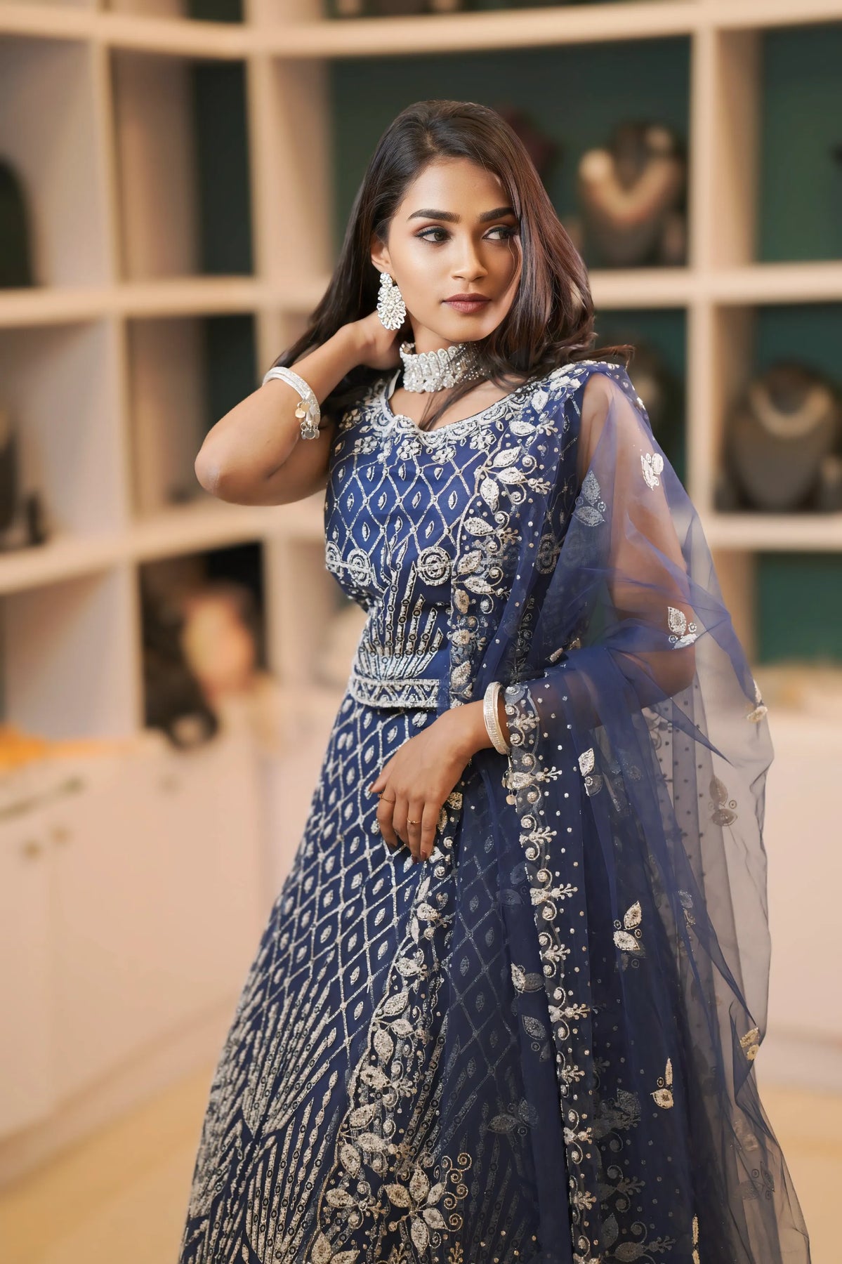 Steal the spotlight in this navy blue embroidered crop top lehenga, featuring rich silver thread embroidery and a matching embellished dupatta. Designed with a sleeveless crop top and a flowy lehenga skirt, this outfit is perfect for bridesmaids, engagement looks, and festive events.