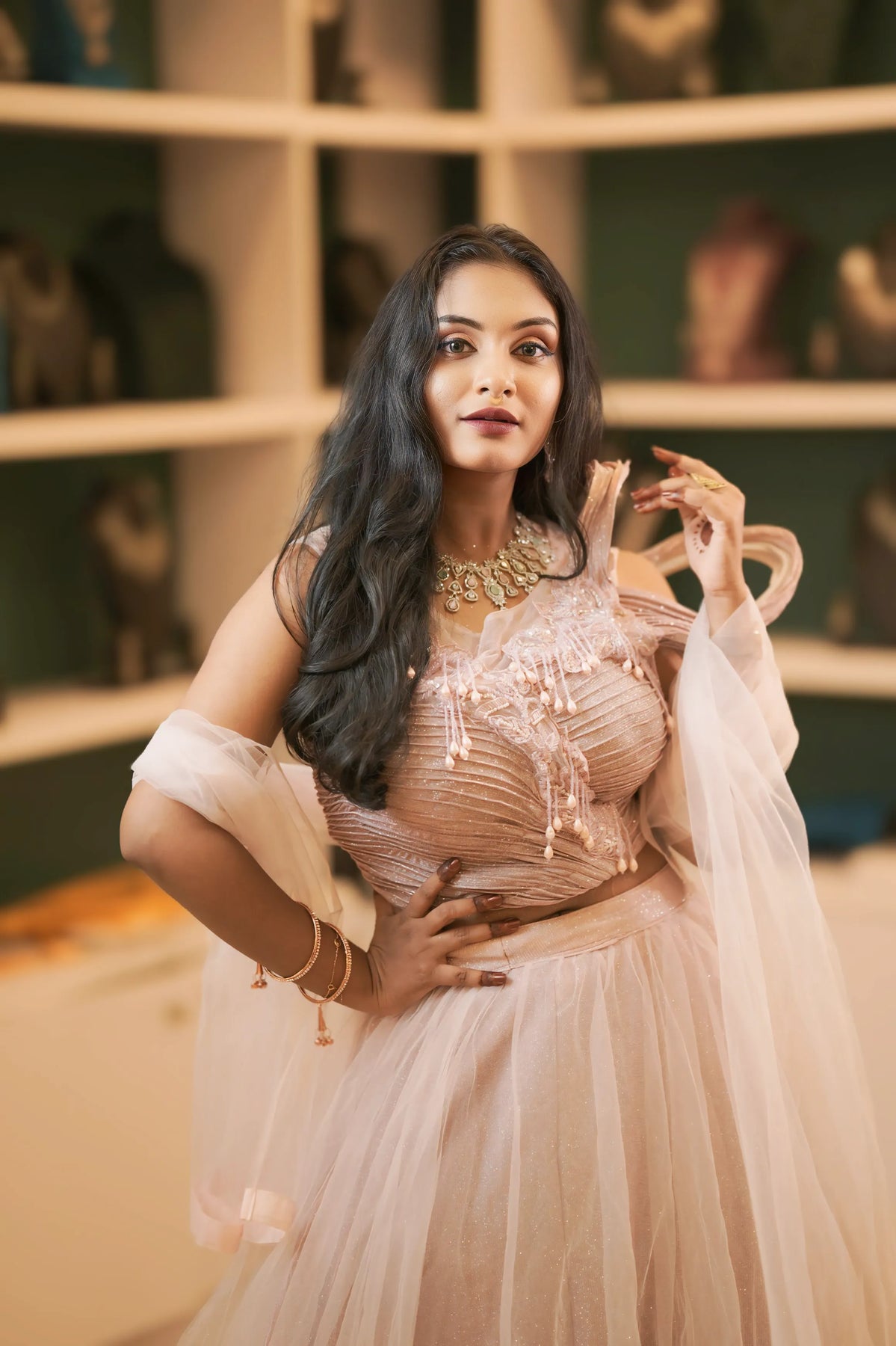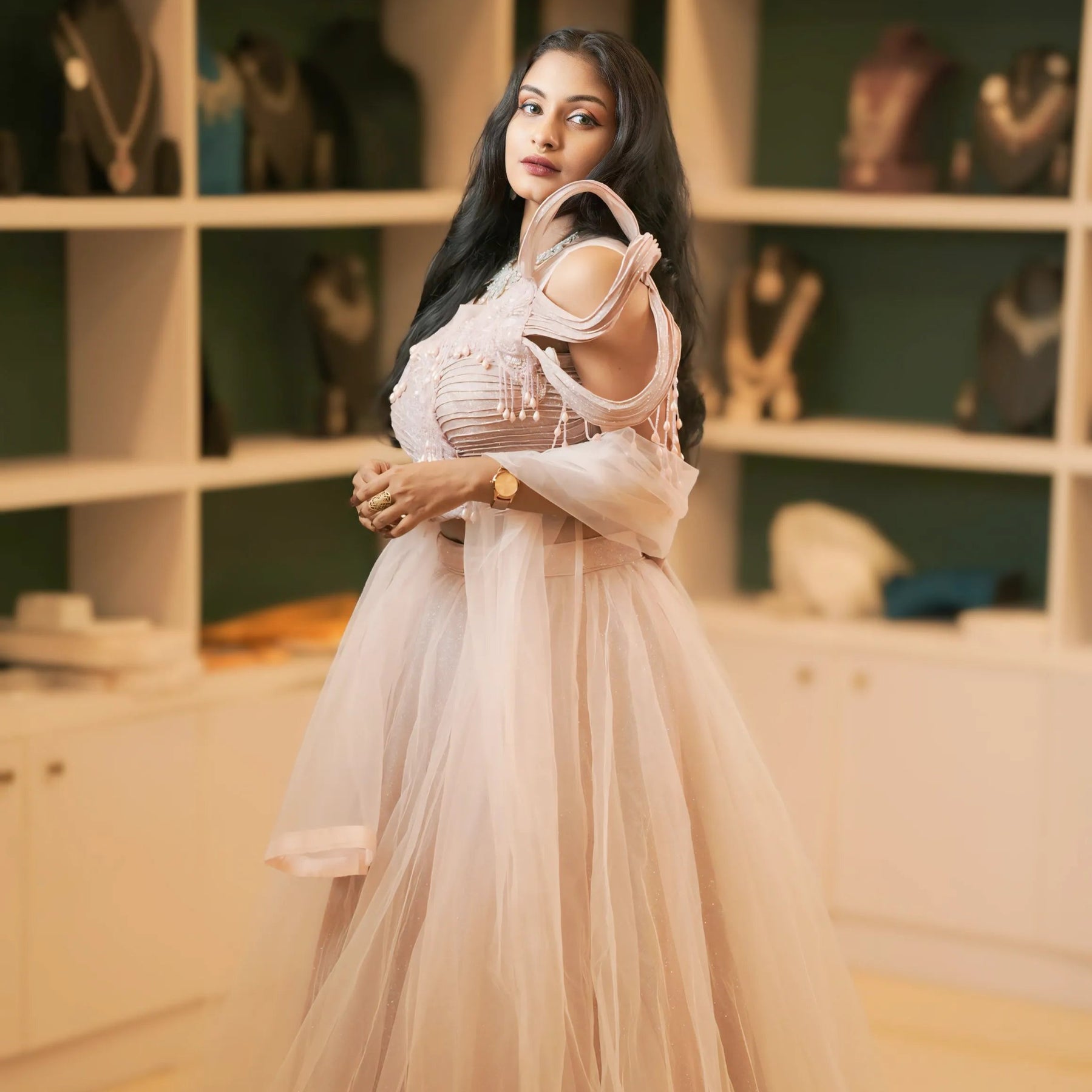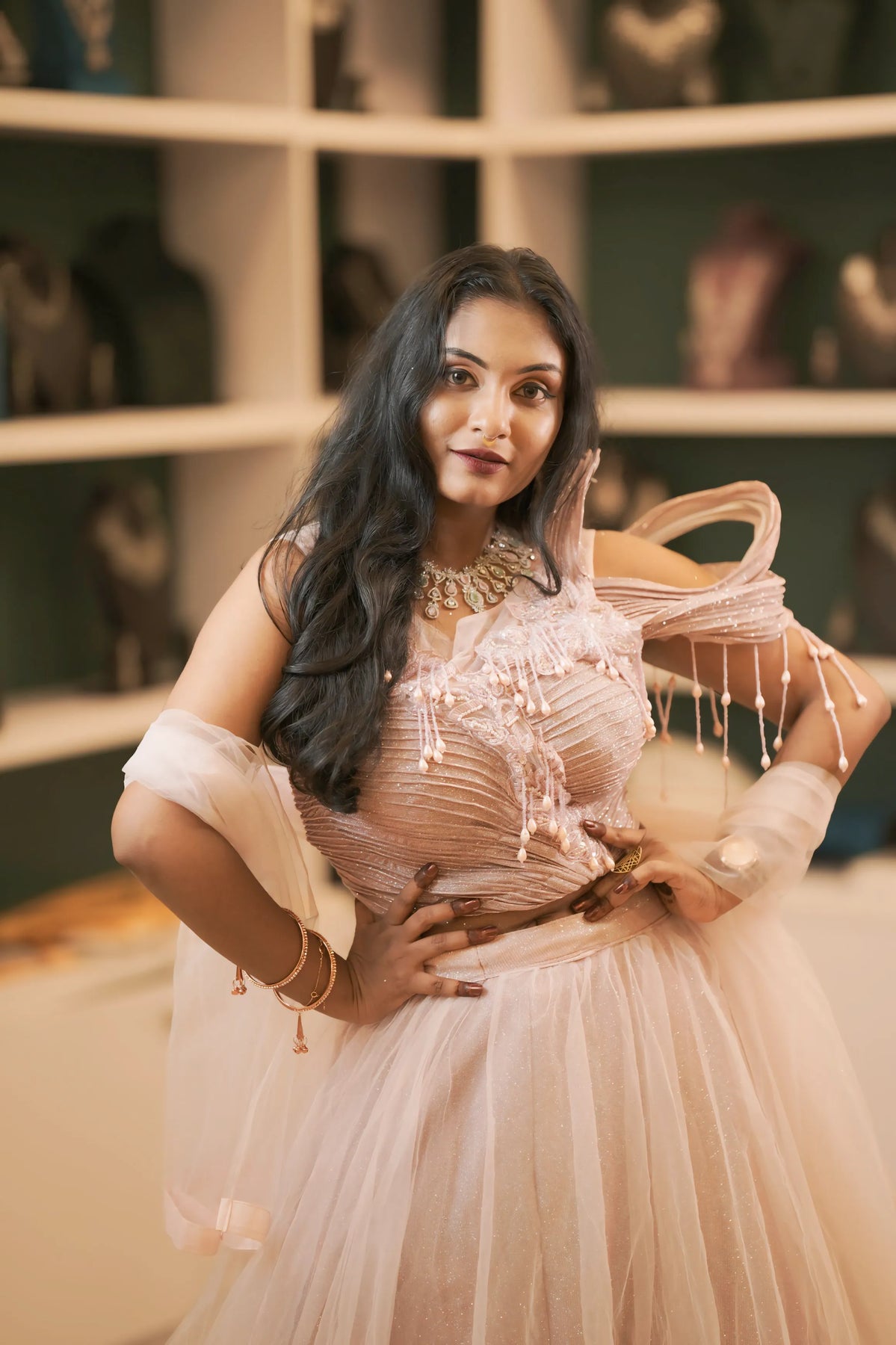 This Pastel Pink Cold-Shoulder Crop Top combines modern style with soft feminine charm, featuring for your special occasions Such as Wedding reception, sangeet function, cocktail parties, and bridesmaid wear.