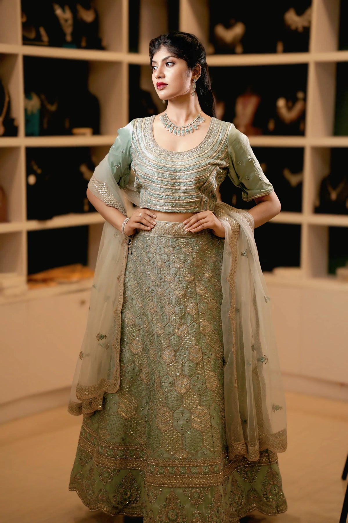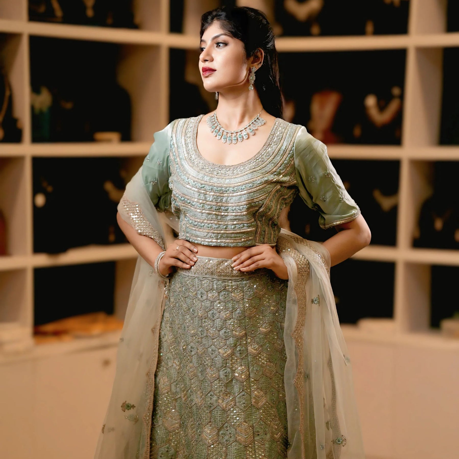 Elevate your celebration look with this Pastel Sage Green Lehenga, a masterpiece of grace and artistry. The richly embroidered blouse, detailed lehenga skirt, and sheer dupatta create a stunning blend of tradition and modern sophistication