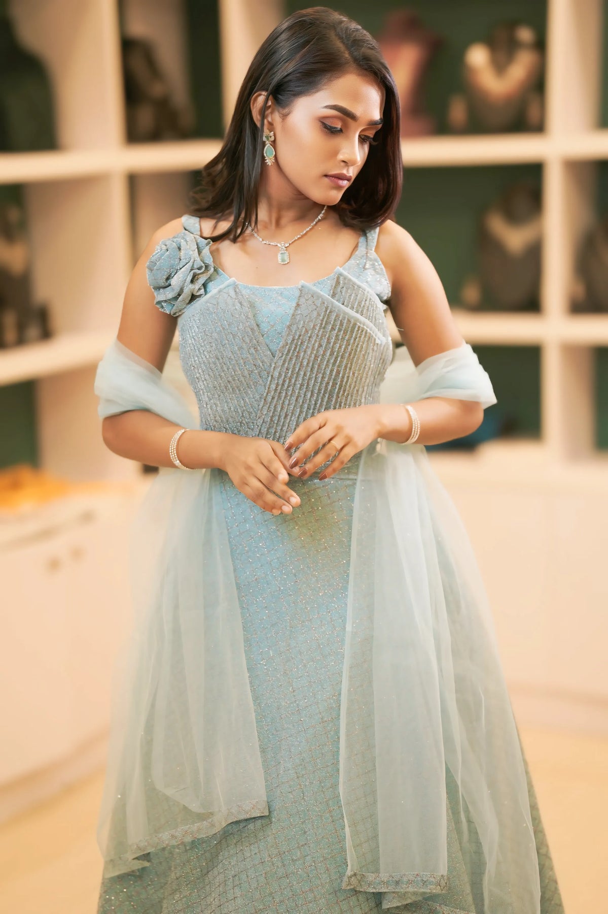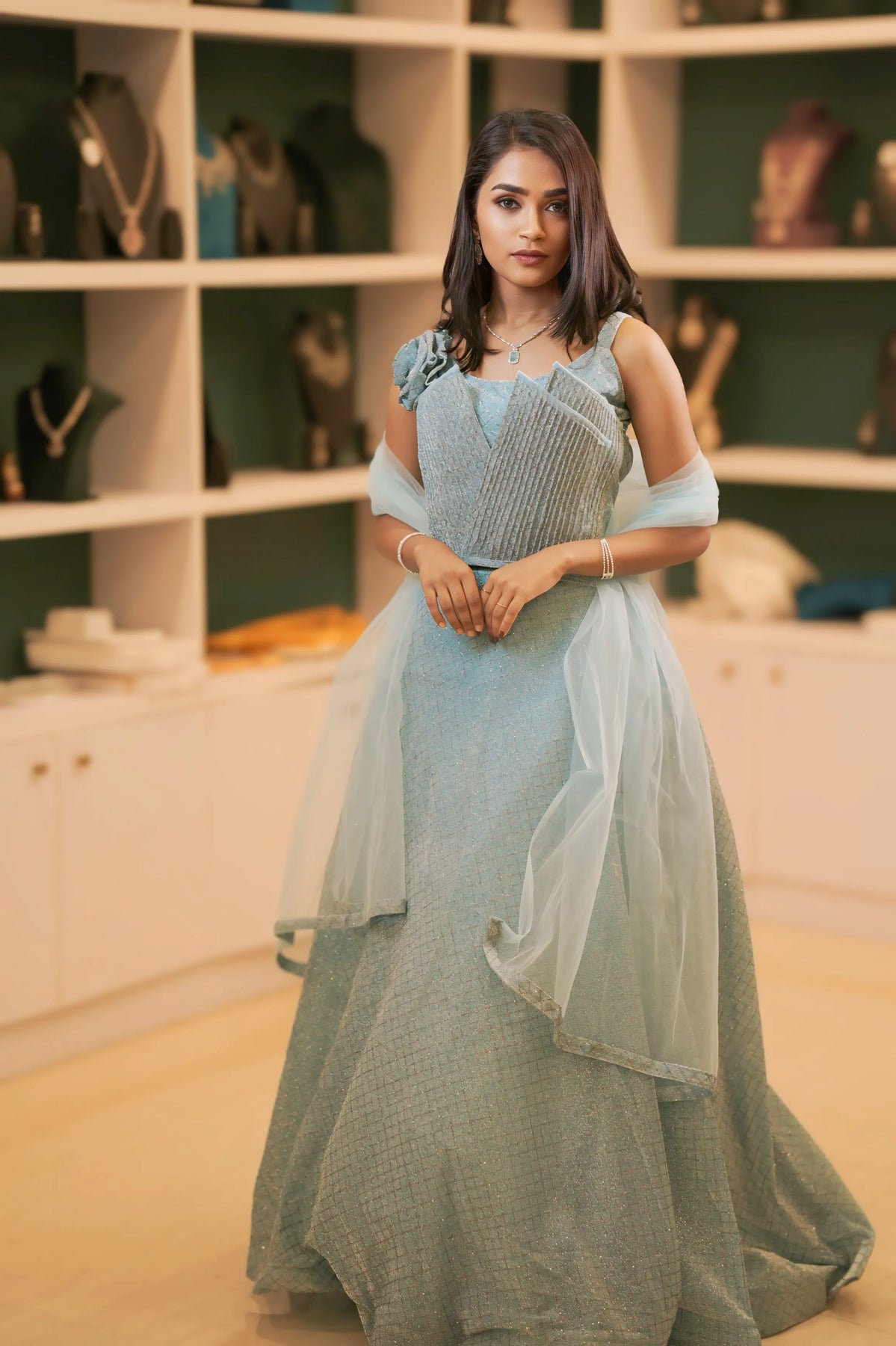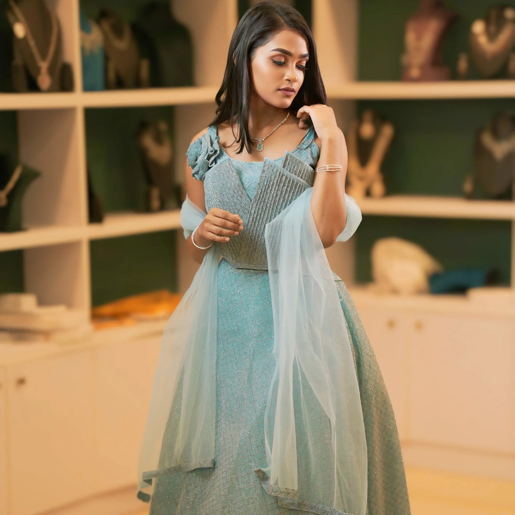 Step into modern elegance with this sky blue embroidered crop top set, paired with a long flowy skirt and sheer dupatta. Perfect for engagements, receptions, and bridesmaid looks, this outfit combines youthful charm with bridal sophistication. The lightweight design ensures you look glamorous while staying comfortable through long celebrations.